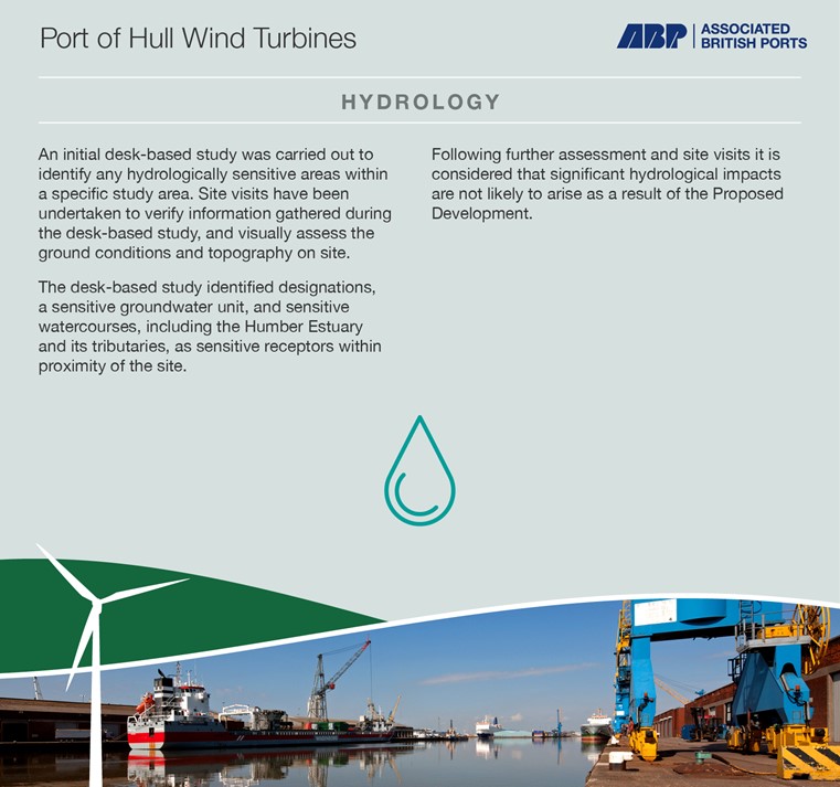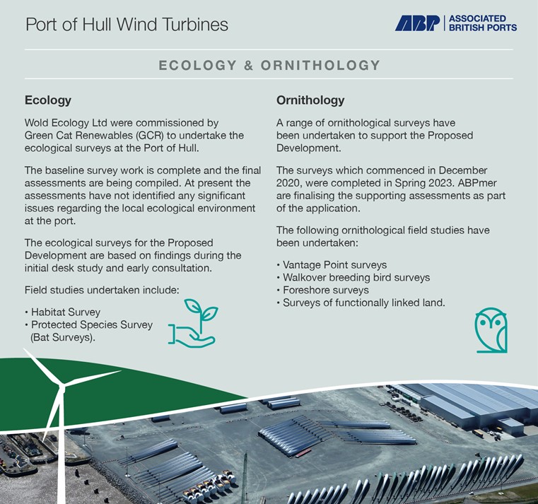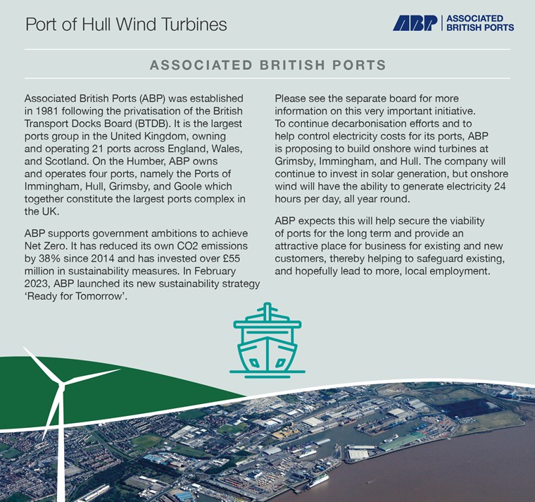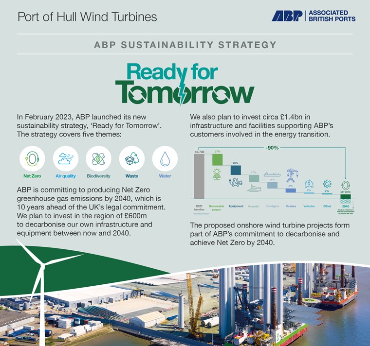 ABP supports government ambitions to achieving Net Zero and recently launched its own £2 billion plan for Energy Transition growth and Net Zero 2040. Called Ready for Tomorrow, it looks to meet the challenges and grasp the opportunities. ABP has already reduced its own CO2 emissions by over 38% since 2014 and invested over £55 million in sustainability measures, which includes the largest commercial rooftop solar array in the UK at the Port of Hull, electric vehicles and cranes across the group and a new fleet of more fuel-efficient pilot boats. More information about the proposed onshore wind development at the Port of Immingham can be found below.