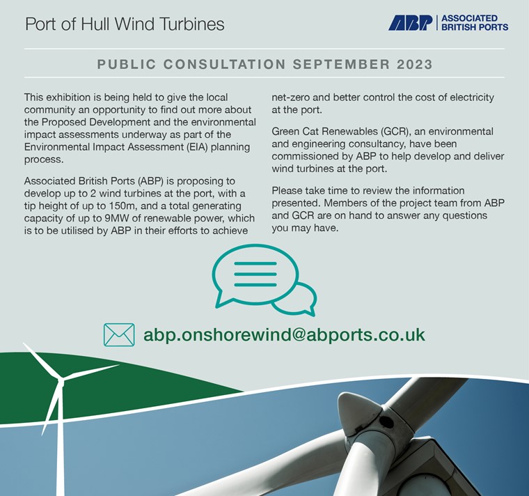 ABP is consulting with stakeholders on plans to install several onshore wind turbines to make the Humber ports greener and more resilient against higher energy costs. To continue decarbonisation efforts and to help control electricity costs for the ports, ABP is proposing to build onshore wind turbines at Grimsby, Immingham, and Hull. The company will continue to invest in solar generation, but onshore wind will have the ability to generate 24 hours per day all year round. ABP expects this will help secure the viability of the ports for the long term and provide an attractive place for business for existing and new customers, thereby helping to safeguard existing, and hopefully lead to more, local employment at the ports.